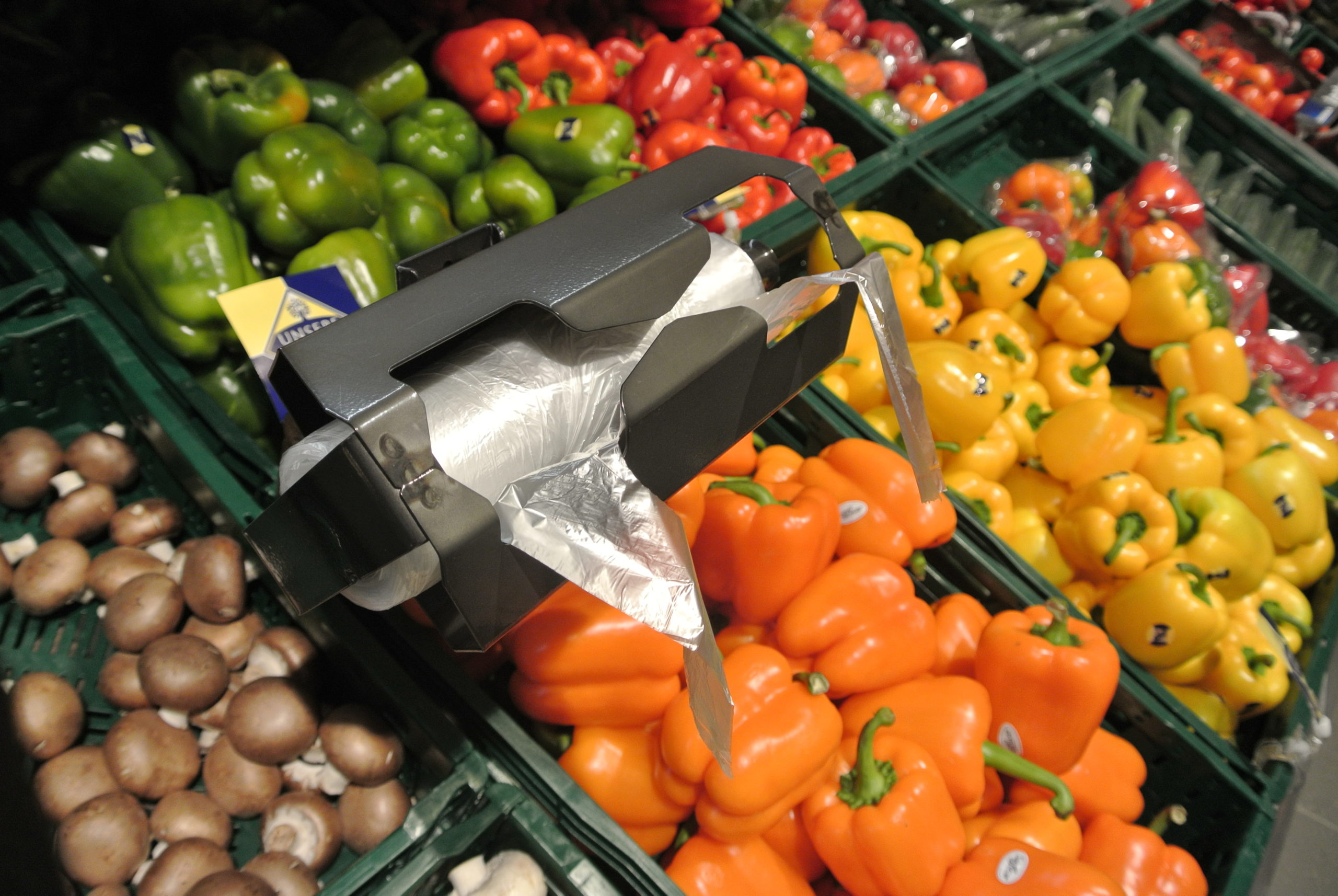 Beutelabroller mit Abreißlasche, Rollen seitlich aufsteckbar.