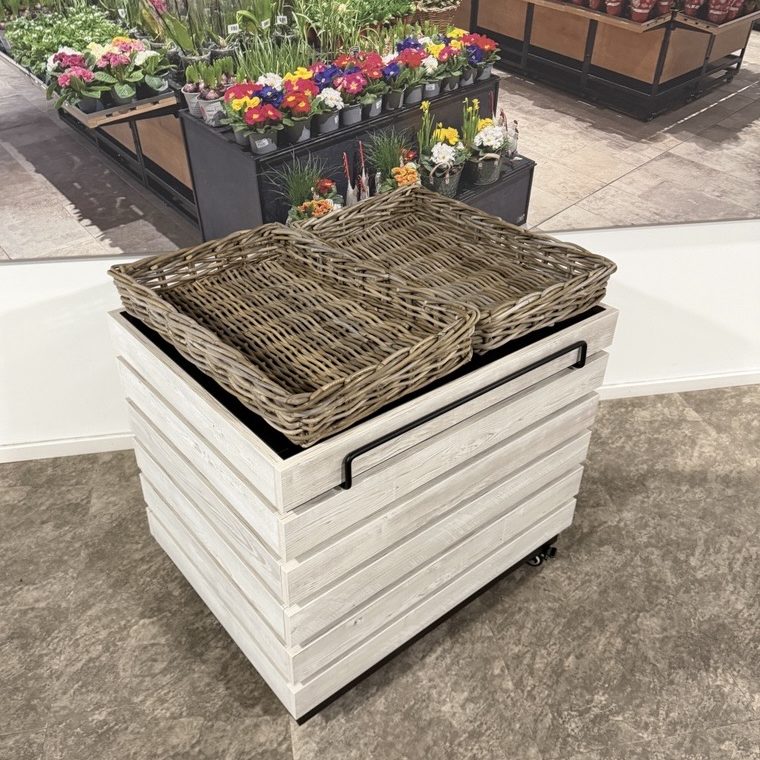 Robust konstruiert mit Schwerlastboden und Schwerlastrollsockel. Damit sind sowohl Wein-Aufbauten wie Saison-Aufbauten schön gestaltbar.