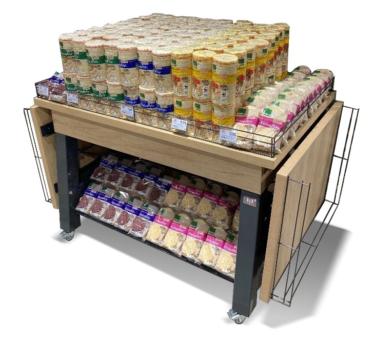 Die Front‑ und Heckblenden lassen sich einklappen und flexibel als zusätzliche Warenstufen nutzen – für mehr Struktur, bessere Übersicht und höhere Abverkäufe.