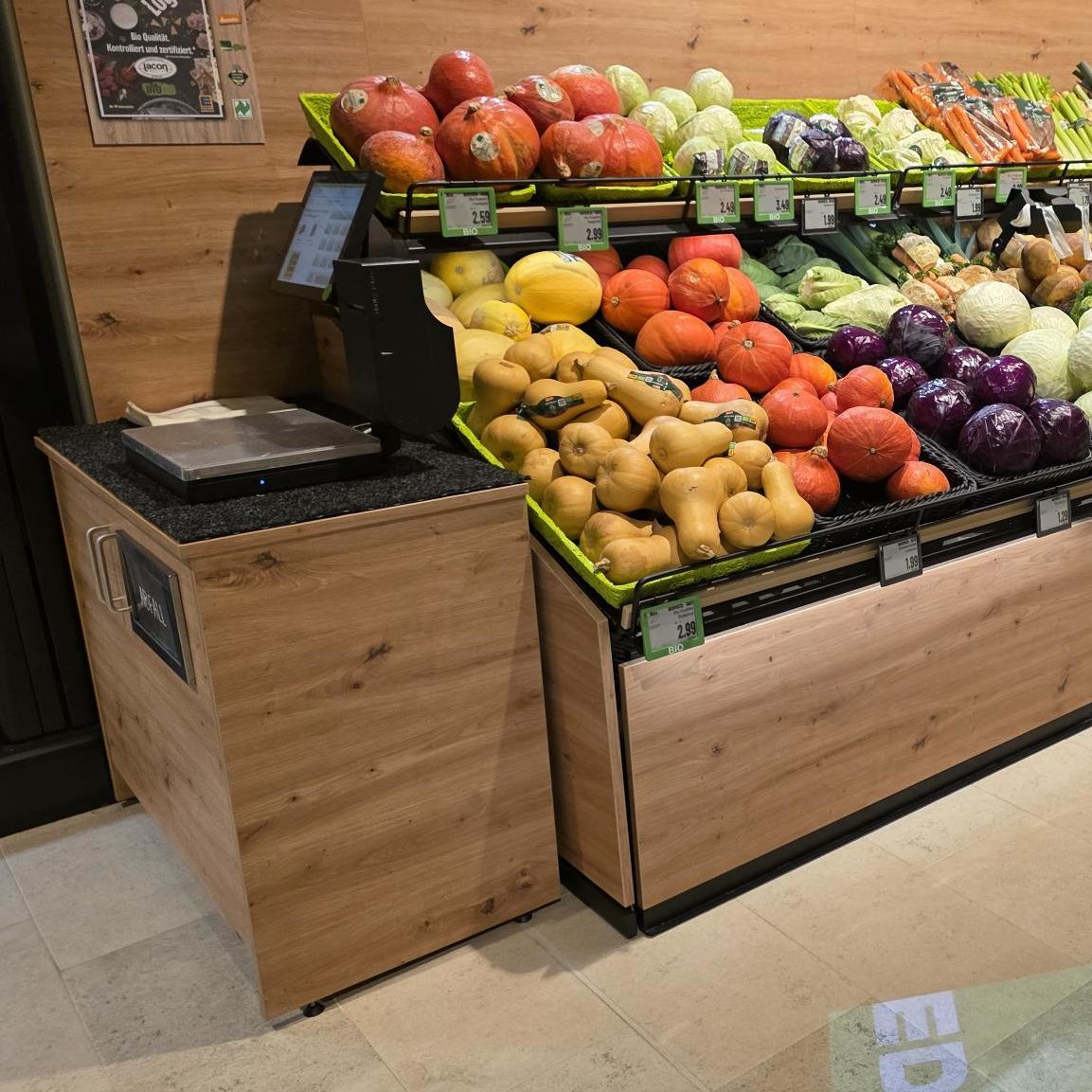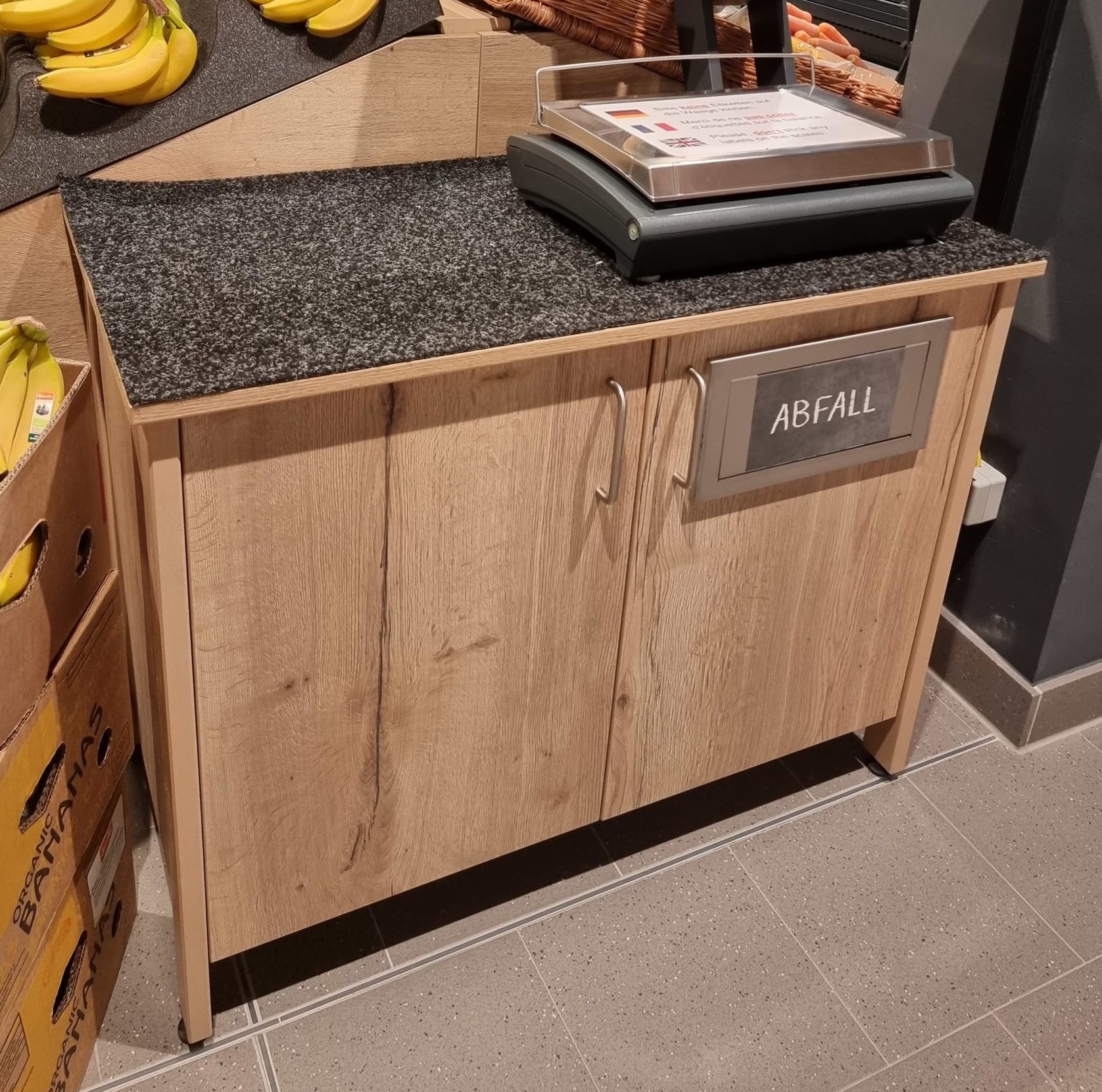 Holz-Waagetisch, Abfallsammler mit Schwingeinwurf