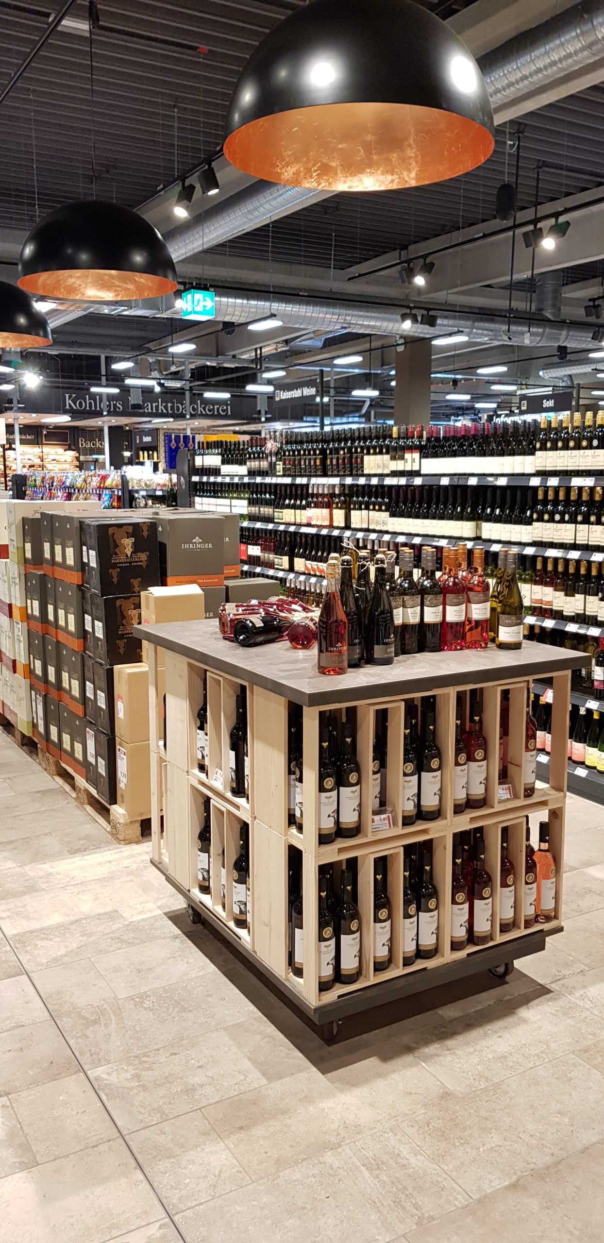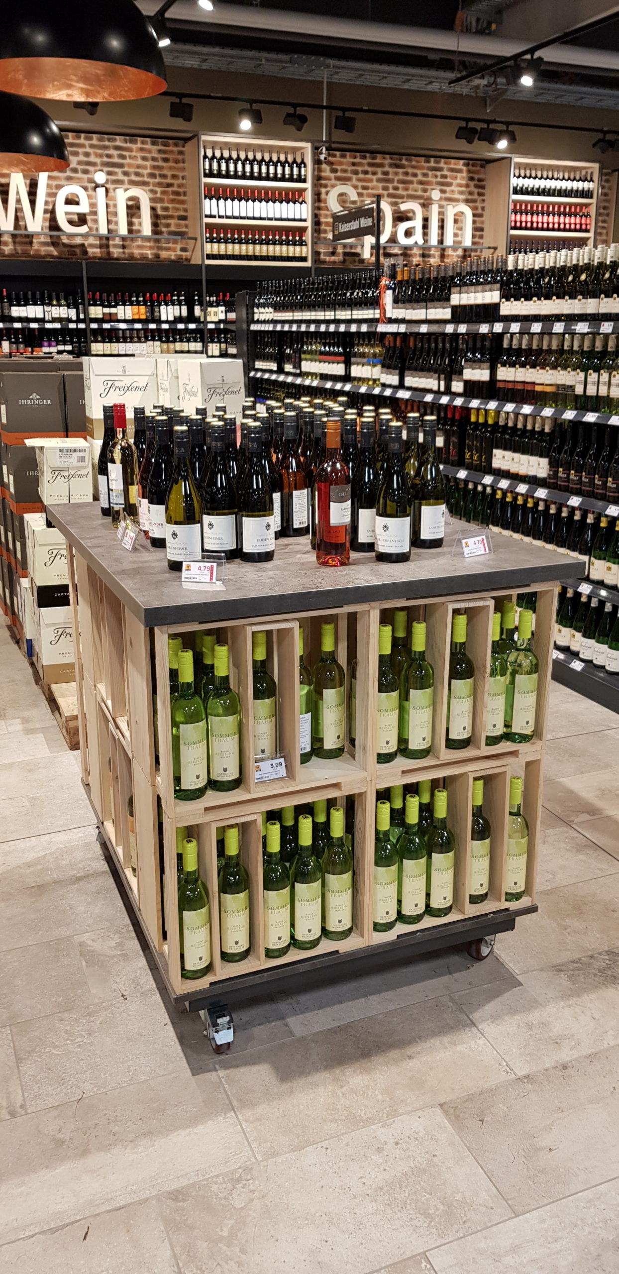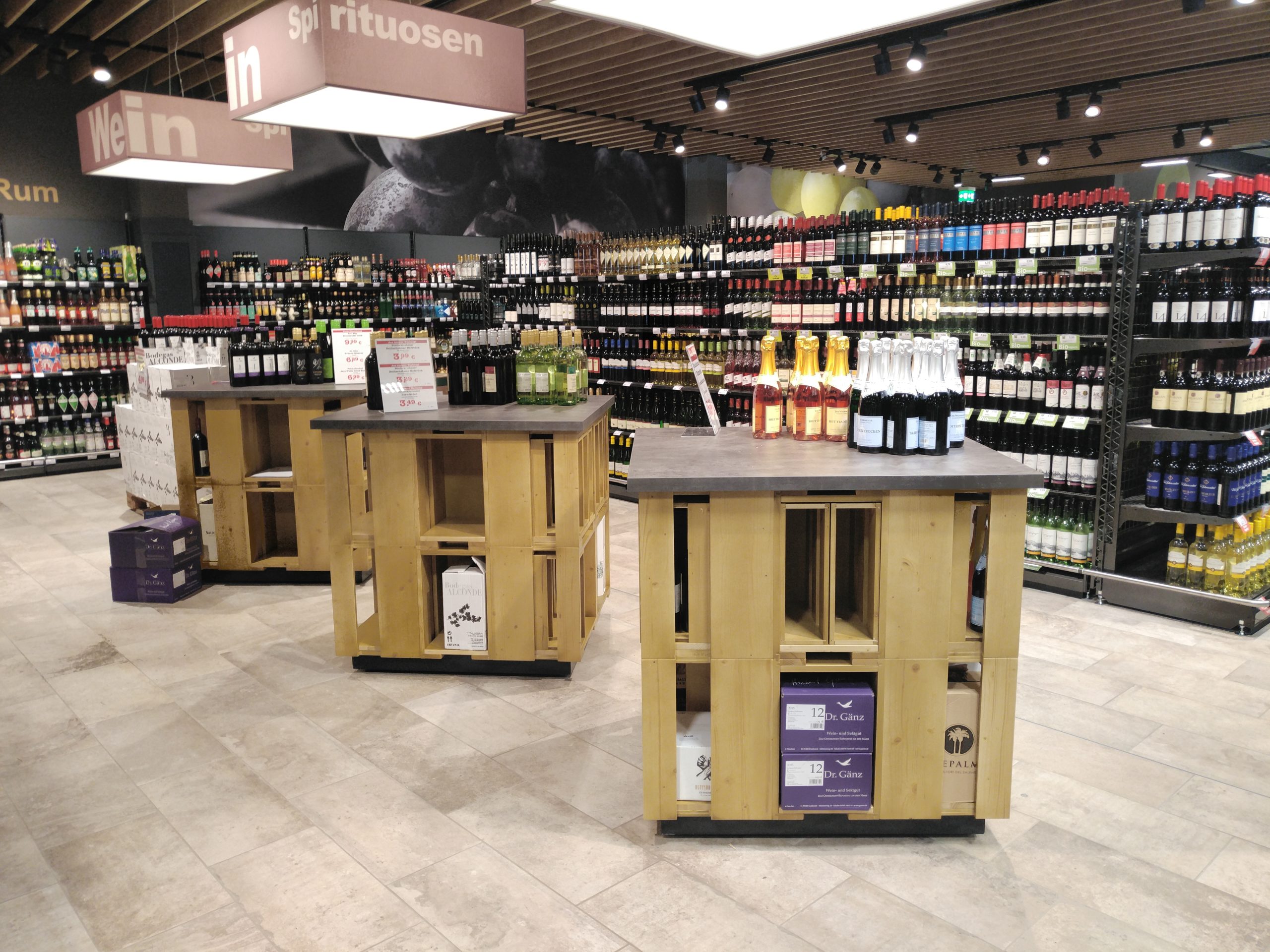 Wein-Insel zur Präsentation von Weinflaschen. Mit dieser Wein-Präsentations-Insel können sie flexibel Ihren Wein und Spirituosen präsentieren oder Geschenkaufbauten in Szene setzen.